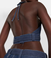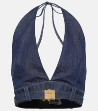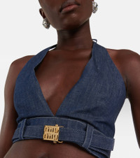 Uninhibited, carefree, and deliberately subversive: these are the hallmarks of Miuccia Prada’s Miu Miu. Spotlighting a penchant for off-kilter proportions, this blue denim halterneck bralette has a buckled detail with engraved gold-tone hardware. Product Details - Material: 100% cotton - Care instructions: dry clean - Made in Italy - Designer color name: Bleu - Lining: 100% viscose - Closure: hook fastening, self-ties - Item number: P00843969 Size & Fit - Fits large to size - we recommend trying one size smaller - Low back - Fitted - Cropped - The model seen in the picture is 178cm-5'10" and wearing a size IT 38