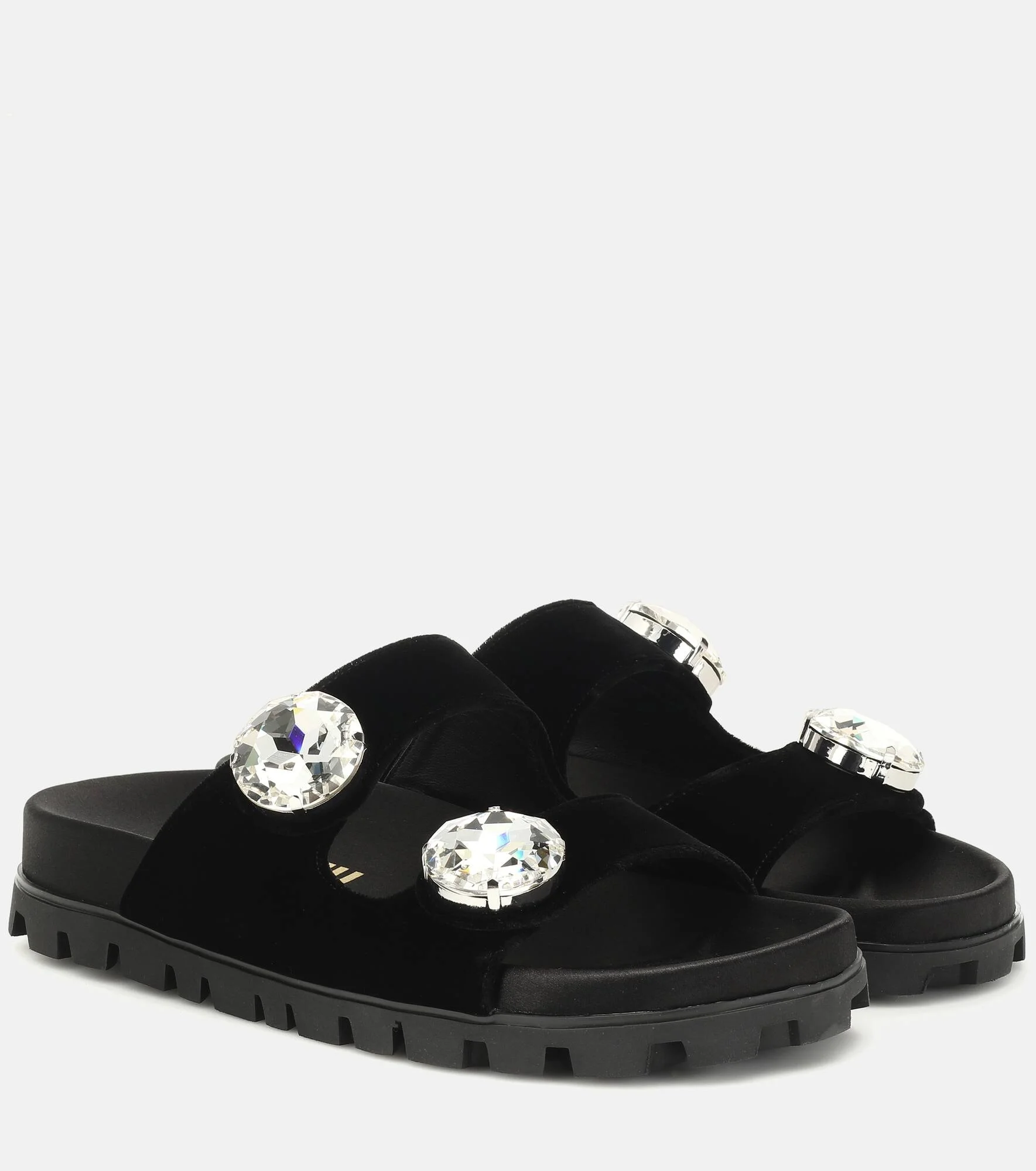 Miu Miu upgrades an essential summer shoe by crafting this pair of sandals out of black velvet with oversized crystal embellishments. The two-strap design is made in Italy with a chunky rubber heel for a modern touch. Wear yours with animal-printed separates for a daring finish. Product Details - Upper: velvet - Toe shape: round open toe - Lining: leather - Trim: glass - Sole: fabric insole, rubber sole - Designer color name: Nero - Made in Italy - Item number: P00404087 Size & Fit - True to size - European sizes - 2,5cm-1" platform (size EU 38) - 3cm-1" wedge heel (size EU 38)