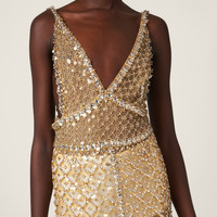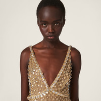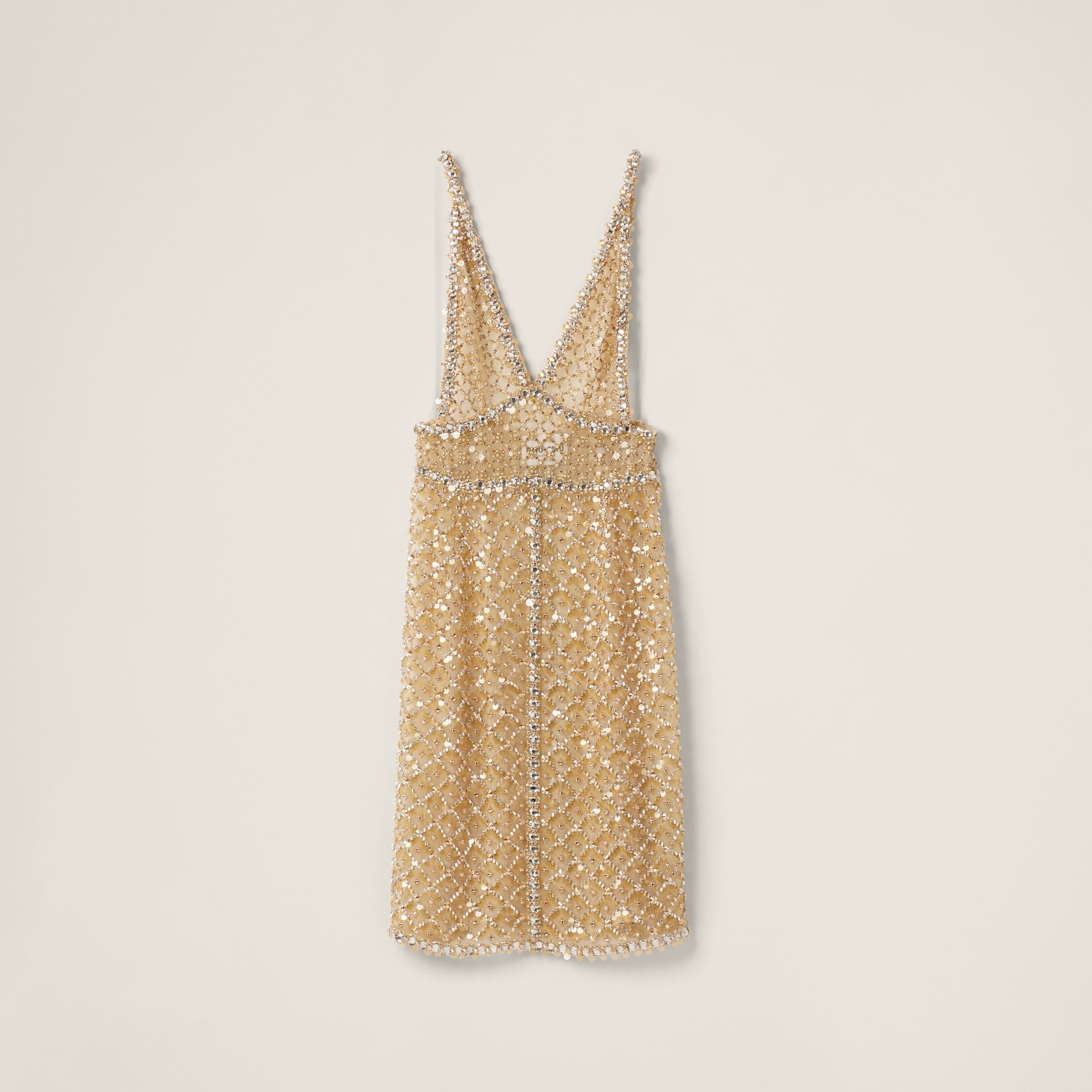 A refined aesthetic characterizes this organza dress. The diamante embroidery creates a geometric pattern all over the garment, adding a subtle sparkle. - Product code: MF5201_1370_F0036_S_OOO - Flared fit - Lined - Plunging V neck - Side closure with snaps and hook - Side slit - Imported - The model is 179 cm tall and wears a size 38