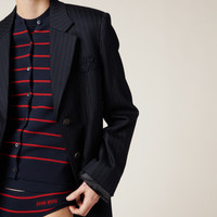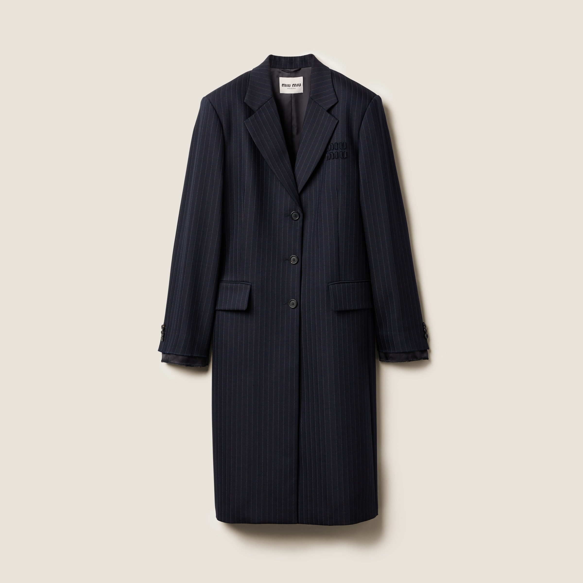 A pinstripe pattern and straight lines, inspired by menswear, are combined in this coat. The back vent lightens the silhouette while the embroidered logo completes the design with an iconic note. - Product code: MS2013_15MQ_F0008_S_OOO - Menswear fit - Lined - Notch lapel - Front button closure - Long sleeves with raw-cut edge - Flapped patch pockets - Back vent - Embroidered logo - Imported Height 110cm Materials Main material: 2% Cotton 2% Elastane 96% Virgin Wool