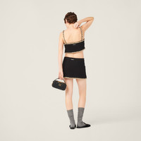Shimmering trim and details cover this tweed top. The modern cropped cut is combined with the classic tweed pattern, creating a refined personality. The Miu Miu logo adds its signature touch to this stylish garment. - Product code: MT1949_139N_F0002_S_OOO - Cropped fit - Lined - Straight neckline with straps - Side zipper closure - Knit logo label - Embroidered straight hem - Imported - The model is 178 cm tall and wears a size 38 Materials Main material: 4% Polyamide 96% Wool