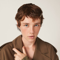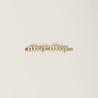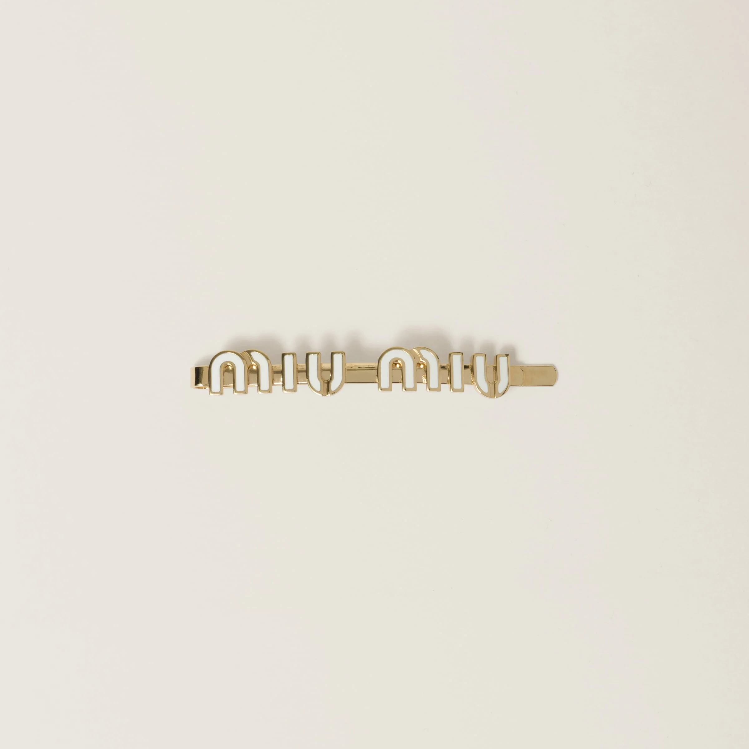 The visible Miu Miu logo gives this clip iconic and immediately recognizable style, becoming the emblem of a detail that makes all the difference. - Product code: 5IF146_2F6T_F0009 - Metal and colored enamel - Visible logo - Imported Height 0.77cm Width 6.2cm Materials Main material: Brass