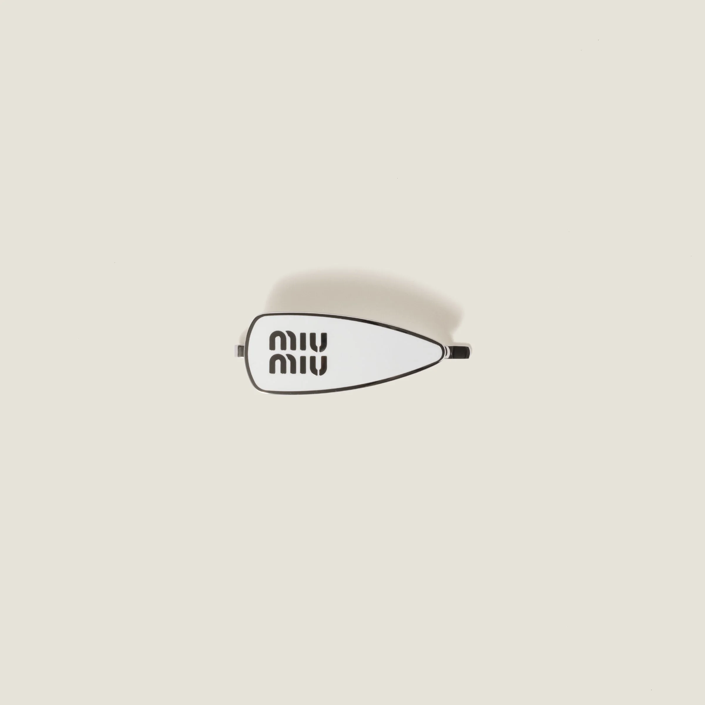 The visible Miu Miu logo gives this clip iconic and immediately recognizable style, becoming the emblem of a detail that makes all the difference. - Product code: 5IF147_2F6T_F097W - Metal and colored enamel - Visible logo - Imported Height 2.2cm Width 6.2cm Materials Main material: Brass