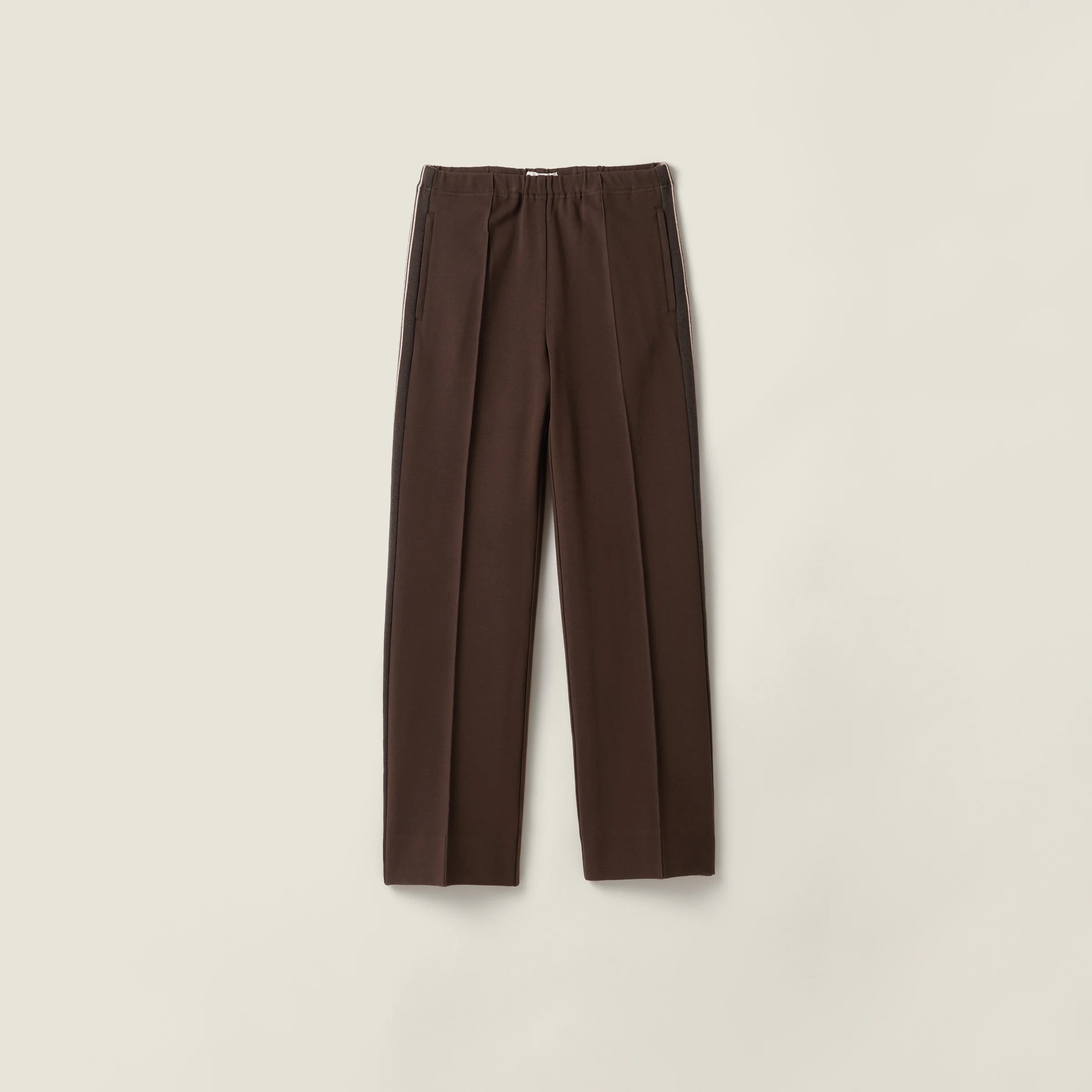 These knit pants stand out for their fabric stitch and a contemporary attitude that reinterprets simplicity with clean lines redefined by bold details full of character. - Product code: MP1935_18FQ_F0324_S_OOO - Straight fit - Unlined garment - Welt pockets - Knit band on the hips - Embroidered logo - Imported - The model is 177 cm tall and wears a size 38 Height 100cm Materials Main material: 4% Elastane 11% Polyamide 85% Viscose