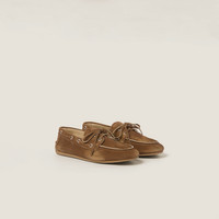 Miu Miu rethinks boat shoes to create new and surprising combinations. The embossed logo on the tongue completes the design with an iconic note. - Product code: 5D123E_Z5O_F0401_F_D005 - Apron with laces - Logo embossed on the tongue - -Rubber sole - Removable leather-covered insole - Imported Materials Main material: Calfskin