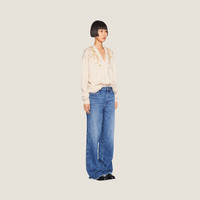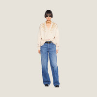 References to the streetwear world define the wide-leg silhouette of these low-rise jeans decorated with the embroidered lettering logo. Blending rebellious spirit and seductive femininity, Miu Miu plays with the silhouettes of iconic styles for women, creating a new balance of proportions obtained by cutting the garments, maintaining the credibility of each and changing their relationship with the body. Edges are raw cut, which is part of a construction process left exposed to emphasize the spontaneity of these actions. - Product code: GWP435_10BF_F0008 - Washed denim - Regular fit - Low-rise waist - Zipper fly with button - Contrasting stitching - Rounded front pockets with coin pocket - Back patch pockets - Embroidered logo - Height: 110cm - Imported