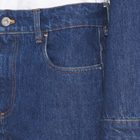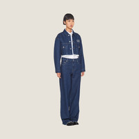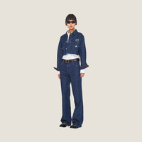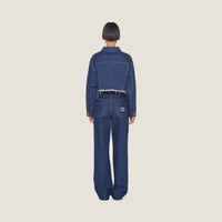 References to the streetwear world define the wide-legged silhouette of these low-rise boyfriend jeans decorated with the embroidered lettering logo. Blending rebellious spirit and seductive femininity, Miu Miu plays with the silhouettes of iconic styles, creating a new balance of proportions obtained by cutting garments, maintaining the credibility of each and modifying the relationship with the body. The unfinished edges are part of a construction process left exposed to underline the spontaneity of these actions. - Product code: GWP435_11D9_F0008 - Washed treatment - Regular fit - Low-rise waist - Zipper fly with button - Contrasting stitching - Rounded front pockets with coin pocket - Back patch pockets - Embroidered logo - Height: 110cm - Imported