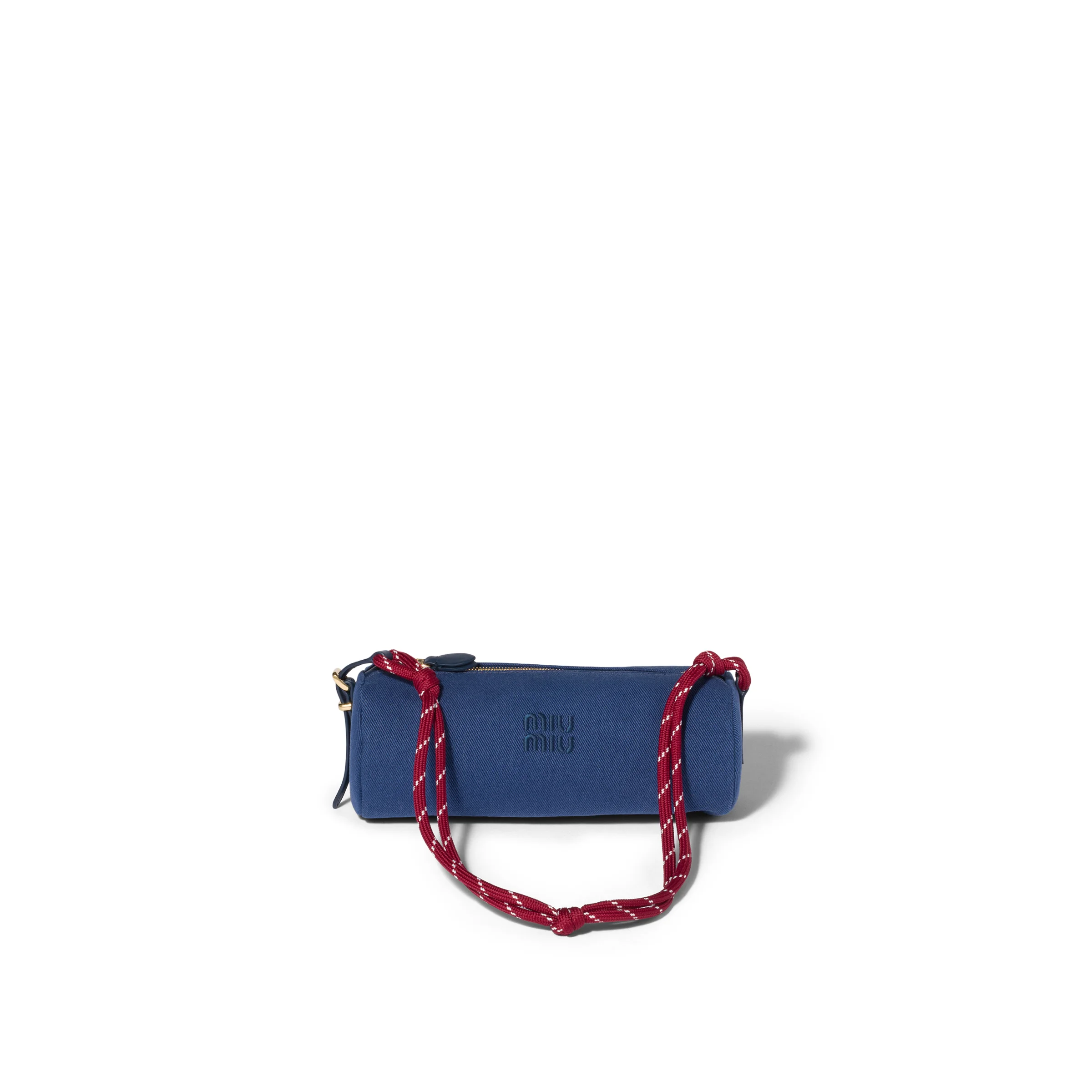 The lines of this pouch are sleeker thanks to the gabardine fabric and embroidered tonal logo, while the two-tone woven tape wristlet becomes an iconic element of Miu Miu style. - Product code: 5NE853_2IA7_F04GM - Zipper closure - Adjustable technical tape shoulder strap - Technical fabric lining - Embroidered lettering logo - Imported Height 9cm Width 22cm Length 9cm Materials Main material: Cotton