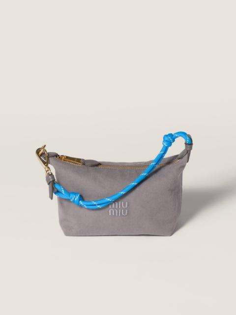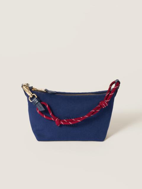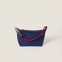The lines of this pouch are sleeker thanks to the gabardine fabric and embroidered tonal logo, while the two-tone woven tape wristlet becomes an iconic element of Miu Miu style. - Product code: 5NE841_2IA7_F04GM - Zipper closure - Woven technical tape wristlet with snap-hook - Technical fabric lining - Embroidered lettering logo - Imported Height 14cm Width 18.5cm Length 10cm Materials Main material: Cotton