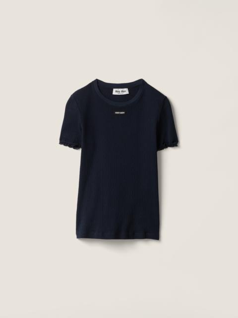 A fine pointelle lace motif inspired by classic lingerie adds a touch of exclusivity and elegance to this garment-dyed cotton top that combines the intense character of its color and refined lace details. - Product code: MT2206_19DF_F0061_S_OOO - Cropped, slim fit - Unlined garment - Short sleeves - Ribbed knit crew neck - Lace-trimmed hem and sleeves - Knit logo label - Imported - The model is 178 cm tall and wears a size 38 Height 45cm Materials Main material: 100% Cotton