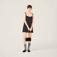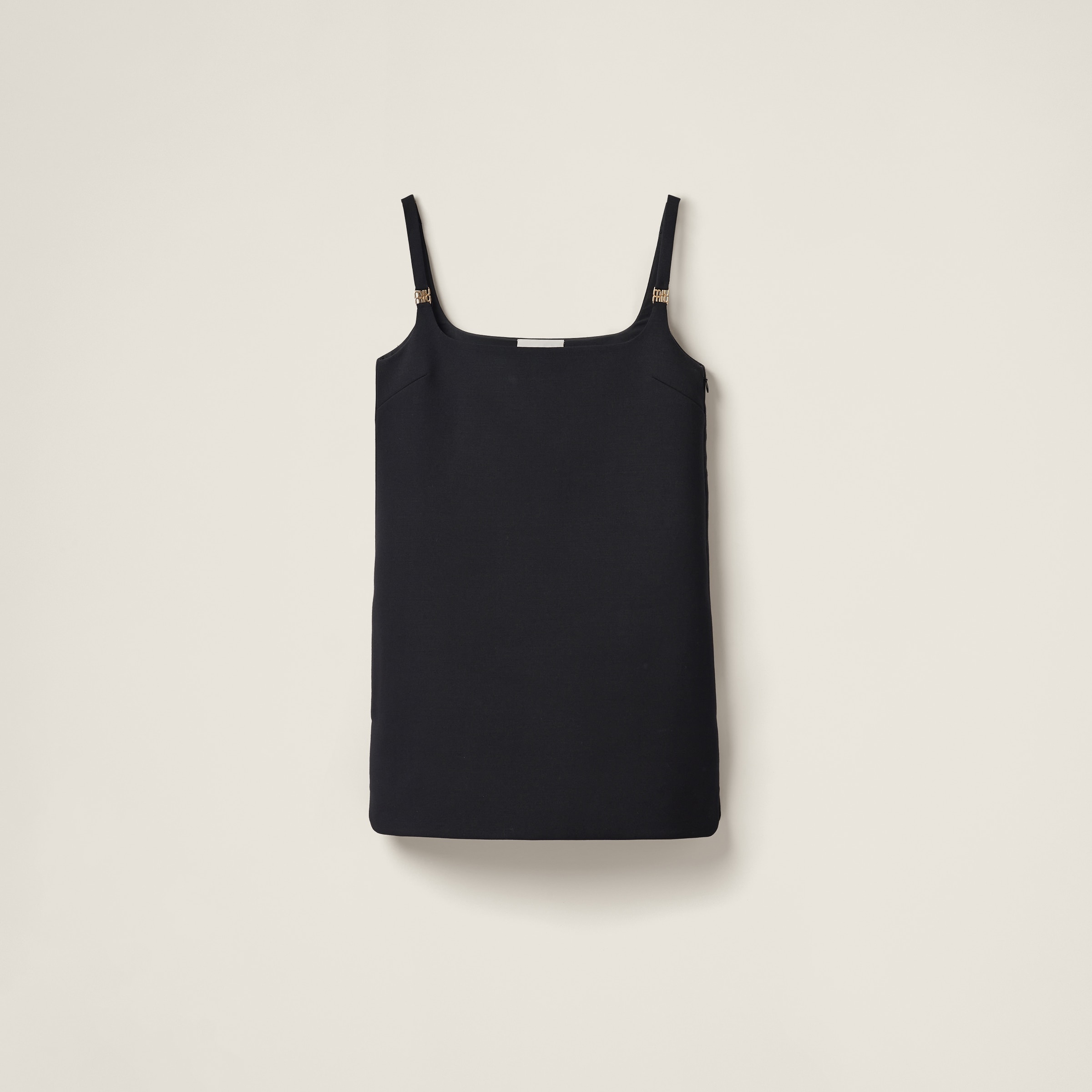 The new metal Miu Miu logo stands out on the straps of this grain de poudre dress, thanks to its unexpected iconic and distinctive touch. The minimalist lines complement the versatile style of the garment. - Product code: MF5208_1R1_F0002_S_OOO - Mini-dress silhouette - Lined - Squared neckline with straps - Side zipper closure - Inseam pockets - Metal logo on the shoulder straps - Side slits - Rounded hem - Imported - The model is 178 cm tall and wears a size 38 Height 80cm Materials Main material: 2% Elastane 98% Virgin Wool