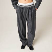 Sartorial inspirations and casual details are combined in these grisaille pants. The classic pleat runs down the leg while the waistband stands out due to the horizontal stripes and Miu Miu logo that adds its signature to this stylish version. - Product code: MP1759_11RF_F0480_S_OOO - Wide-leg fit - Unlined - Elasticized waistband with logo - Angled front slash pockets - Imported - The model is 180 cm tall and wears a size 38 Height 110cm