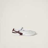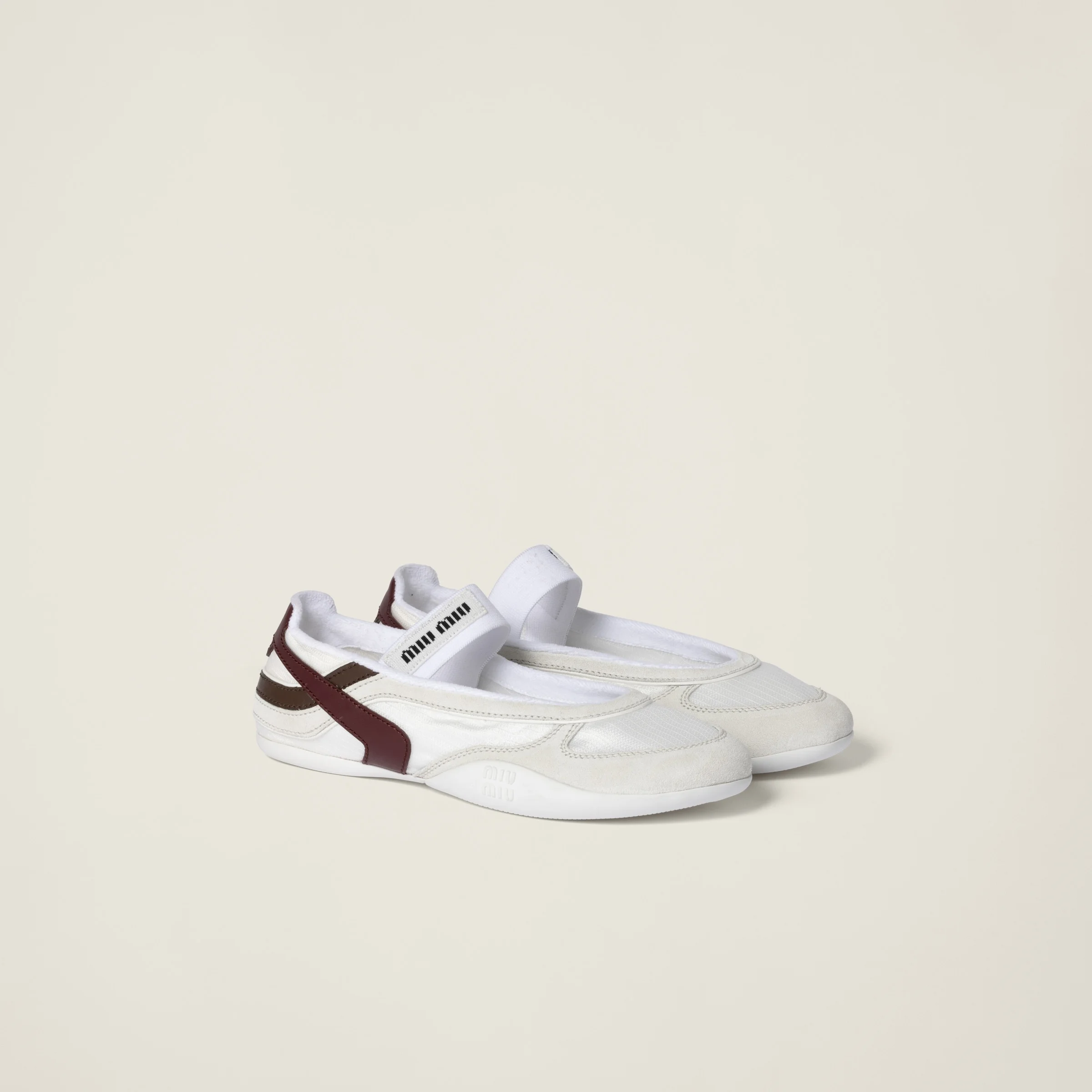 These ballerinas with an ultra-light structure in technical fabric and suede combine casual elements and sports references. The multicolored bands and logo-embossed sole accentuate Miu Miu's sporty-chic character. - Product code: 5F427E_71L_F0X97_F_A005 - Upper with elastic and logo label - Rubber sole with logo - Removable fabric-covered insole - Screen-printed logo on the sole and heel collar - Imported Materials Main material: Recycled Polyamide