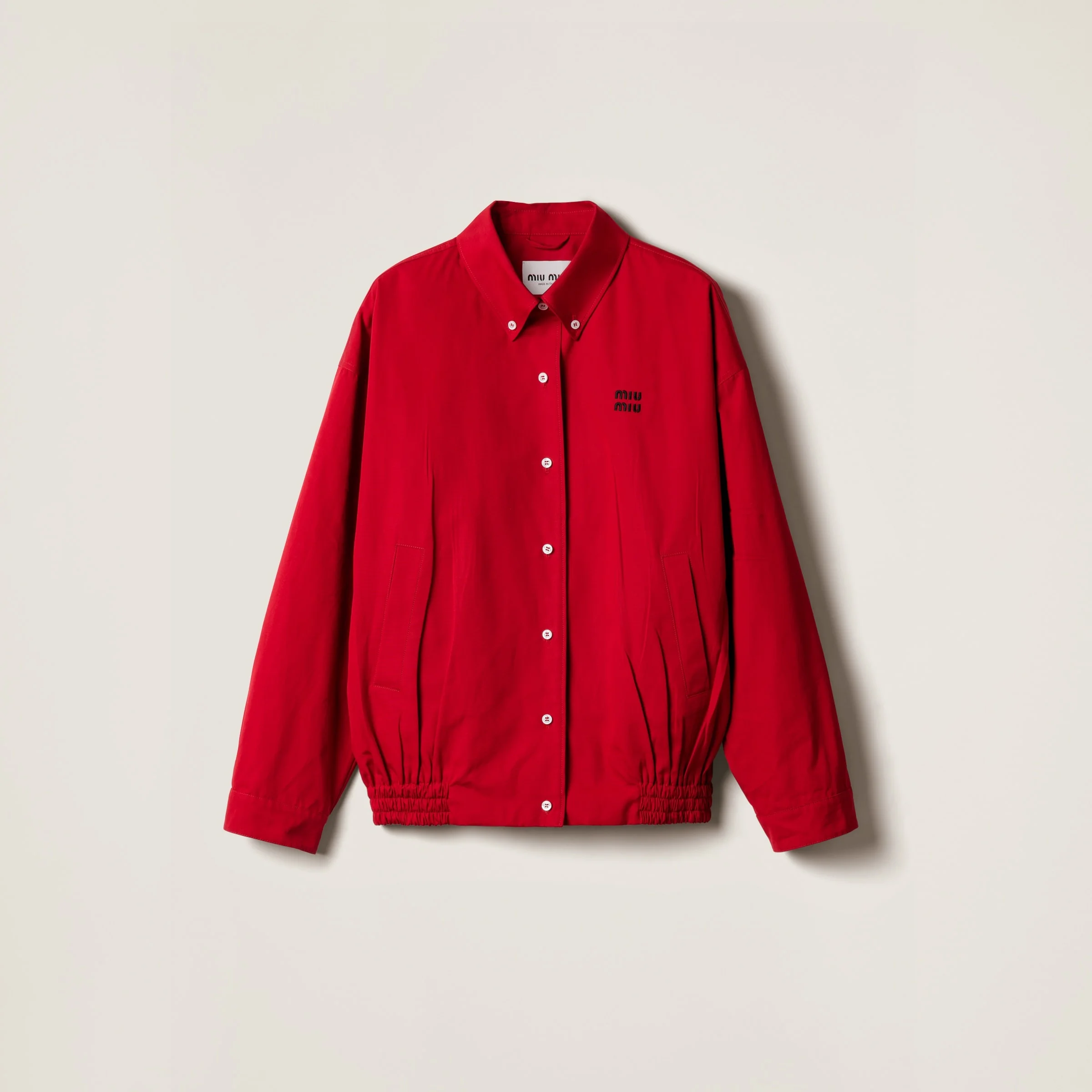 The iconic button-down poplin shirt is reinterpreted in the lines of this blouson jacket with a fresh and original essence that plays with shirtwear and the codes of the Miu Miu wardrobe. - Product code: ML1264_1BMS_F0D56_S_OOO - Lined garment - Long sleeves - Shirt-style collar - Button closure - Welt pockets - With elasticized hem - Embroidered logo - Imported - The model is 178 cm tall and wears a size 38 Height 70cm Materials Main material: 100% Cotton