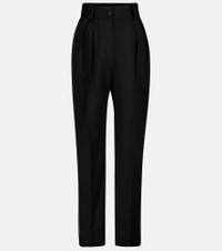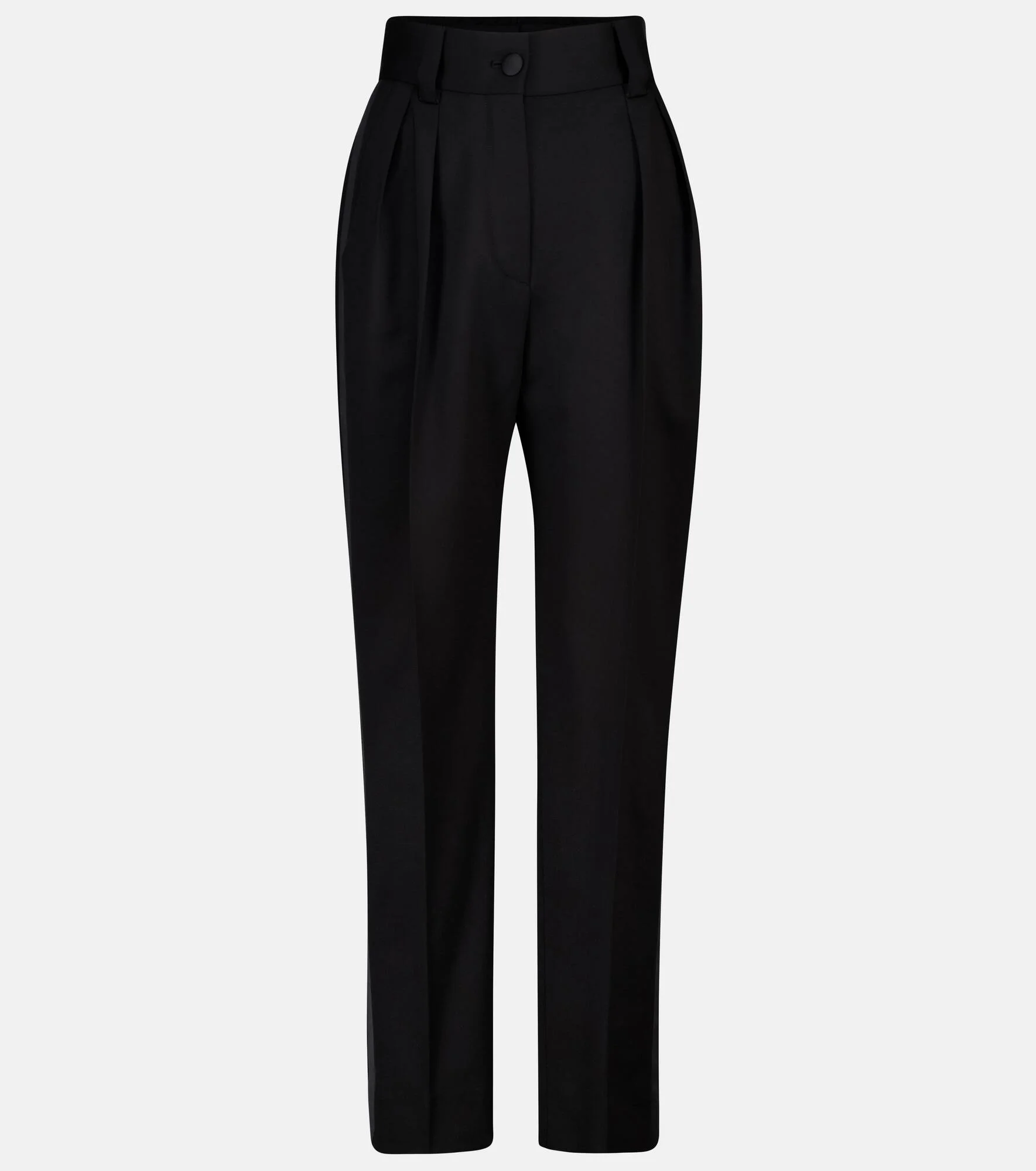 Trimmed with grosgrain stripes, these black pants from Miu Miu are inspired by the traditional tuxedo. Made in Italy from stretch-wool grain de poudre, they have a pleated front and a straight leg that tapers slightly toward the hem. Draw attention to the super high-rise waist by styling with a bralette or cropped blazer. Product Details - Made in Italy - Insert: 60% silk, 40% polyester - Designer color name: Nero - Pocket lining: 100% viscose - Material: 98% wool, 2% elastane - Belt loops - Closure: zipper fly, button fastening - Pockets: side slit pockets, back pockets - Item number: P00528350 Size & Fit - True to size - Tapered leg - High-waisted - The model seen in the picture is 178cm-5'10" and wearing a size IT 40