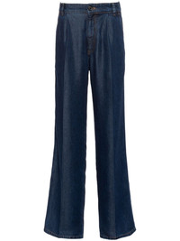 high-rise wide-leg jeans Miu Miu takes a minimalist approach when designing these SS23 collection high-waisted jeans. Presented in navy-blue denim, the wide-leg silhouette is subtly adorned with a gold-tone logo plaque at the back. Highlights - Navy blue - Denim - Gold-tone logo plaque - High waist - Belt loops - Front button and zip fastening - Two rear patch pockets - Contrast stitching - Wide leg Composition Denim 100%