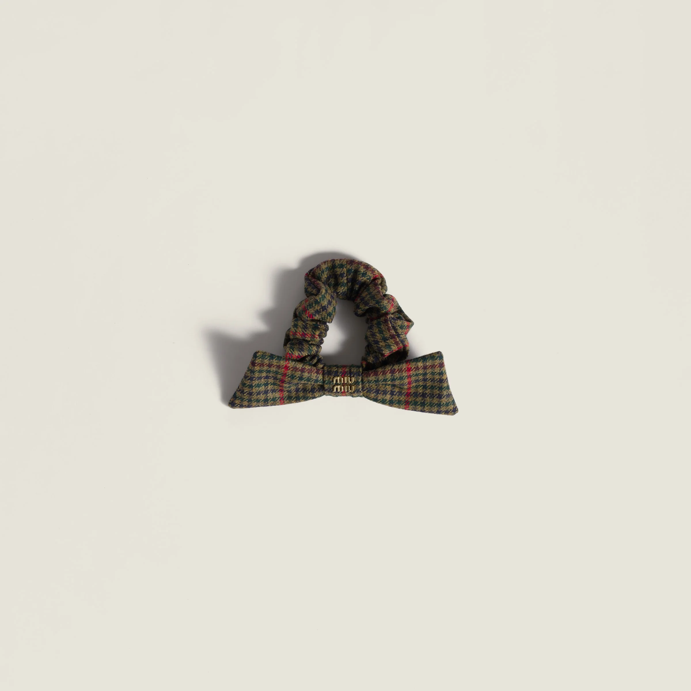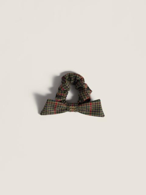 The timeless houndstooth pattern enhances the character and essential design of this scrunchie, highlighting Miu Miu’s experimental dialogue with iconic elements of the men’s wardrobe - Product code: 5IF181_2IEP_F0244 - With central bow - Metal logo lettering - Imported Materials Main material: Virgin Wool