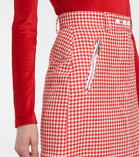 A spin on the classic pencil skirt, this houndstooth-checked design from Miu Miu is a playfully girlish variant, which is guaranteed to catch every eye. Form-fitting and elegant, you can style yours with one of the label's white blouse for an office-ready ensemble that is sure to impress. Product Details - Made in Italy - Material: 100% virgin wool - Closure: zipper fly, button fastening, zipped back - Designer color name: Rosso - Pocket lining: 100% viscose - Care instructions: dry clean - Pockets: zipped pockets - Item number: P00528377 Size & Fit - True to size - High-waisted - The model seen in the picture is 178cm-5'10" and wearing a size IT 40