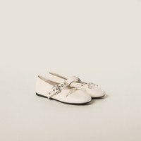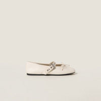 Smooth leather highlights the nuances and details of these leather ballerinas. The buckle and bow introduce a refined stylistic contrast while the Miu Miu logo adds its signature to this stylish version. - Product code: 5F210E_070_F0304_F_005 - Upper with strap, buckle and bow - Screen-printed logo - Rubber sole - Leather-covered insole - Imported Materials Main material: Calfskin