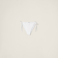 The light, soft, compact and resistant texture of jersey is combined with the refined ties on the sides of this panty. The garment, which can be worn both as a swimsuit bottom and to enrich the looks of the season, features the Miu Miu logo on the tag, adding its signature touch with an iconic note. - Product code: MCO236_131E_F0009_S_OOO - Lined panty - Ties on the sides - Imported - The model is 180 cm tall and wears a size 38 Materials Main material: 22% Elastane 78% Recycled Polyamide