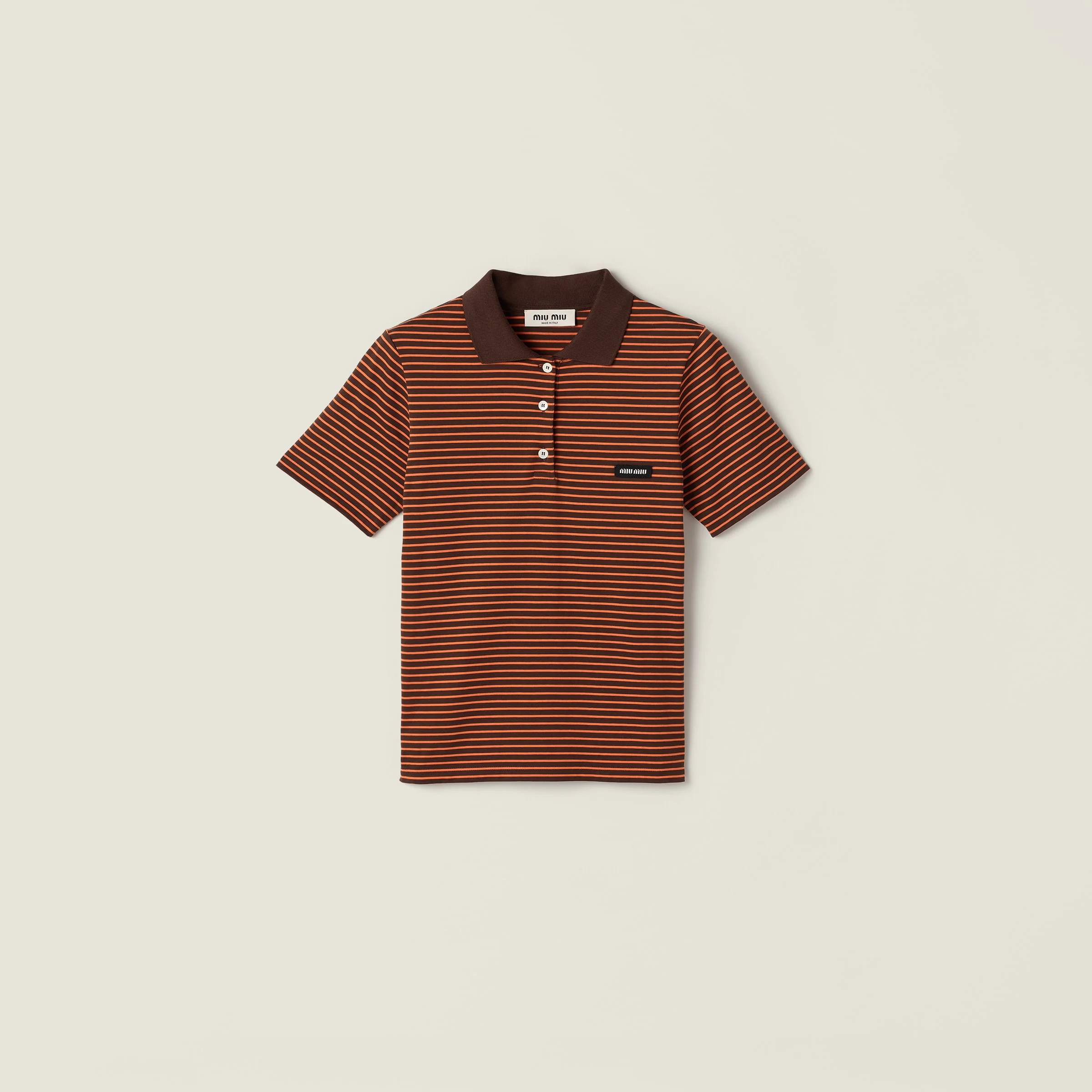 Stripes, an emblem of Miu Miu style, recall a vintage aesthetic that adds playful simplicity to this jersey polo shirt, ideal for creating bold looks through layering different volumes and patterns. - Product code: MJNA13_14RT_F0Q1K_S_OOO - Straight fit - Unlined garment - Polo collar - Front button closure - Short sleeves - Twin-needle hem - Logo patch - Imported - The model is 178 cm tall and wears a size 38 Height 59cm Materials Main material: 100% Cotton