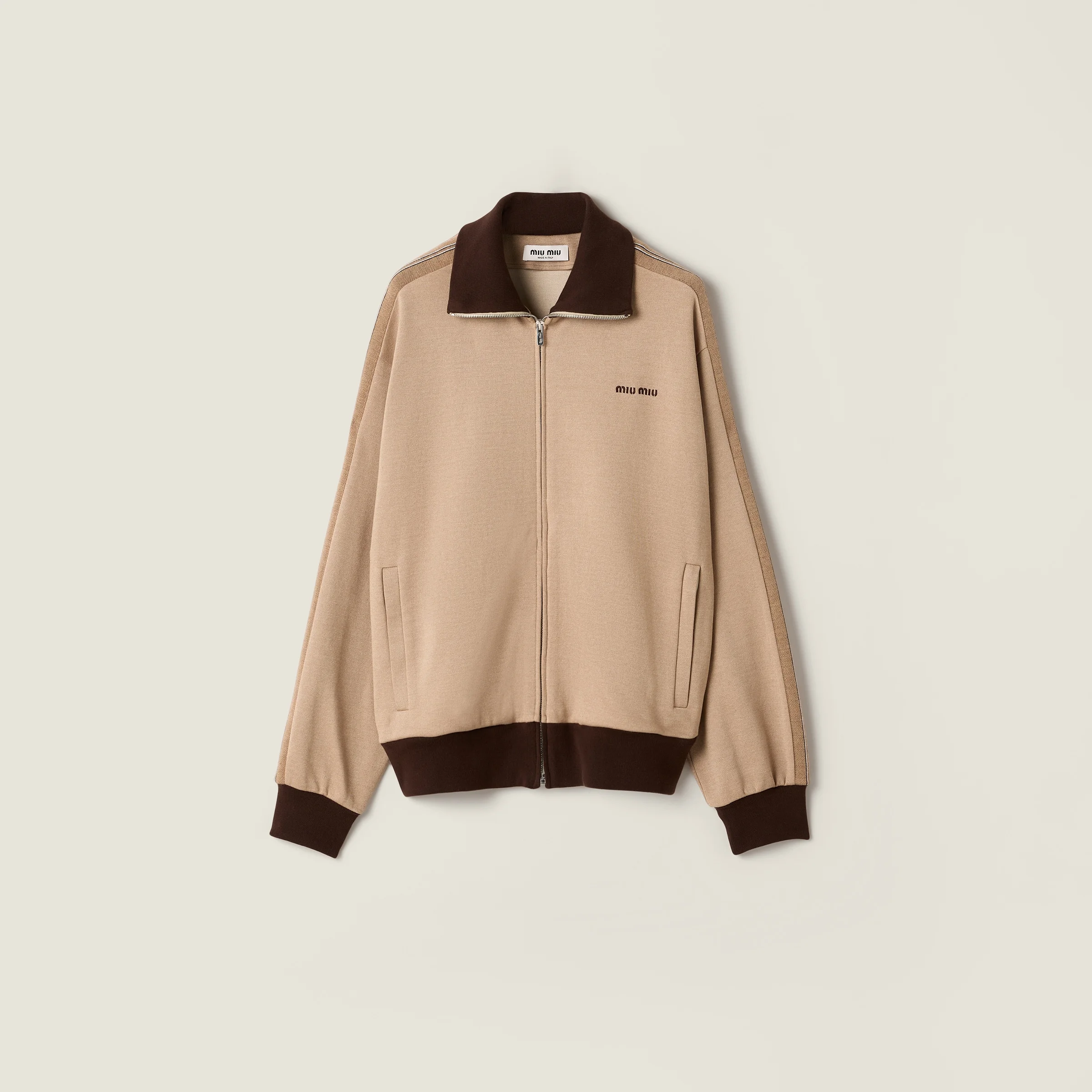 Melange textures and relaxed lines define the balance between sportiness and elegance of this jersey zipper sweatshirt, enriched with details and knit racing stripes in a contrasting color, an expression of Miu Miu's artisanal experimentation. - Product code: MJL980_17I5_F0770_S_OOO - Oversized fit - Unlined garment - Stand-up collar - Front zipper closure - Long sleeves with ribbed knit cuffs - Welt pockets - Straight ribbed knit hem - Embroidered logo - Imported - The model is 178 cm tall and wears a size 38 Materials Main material: 100% Cotton