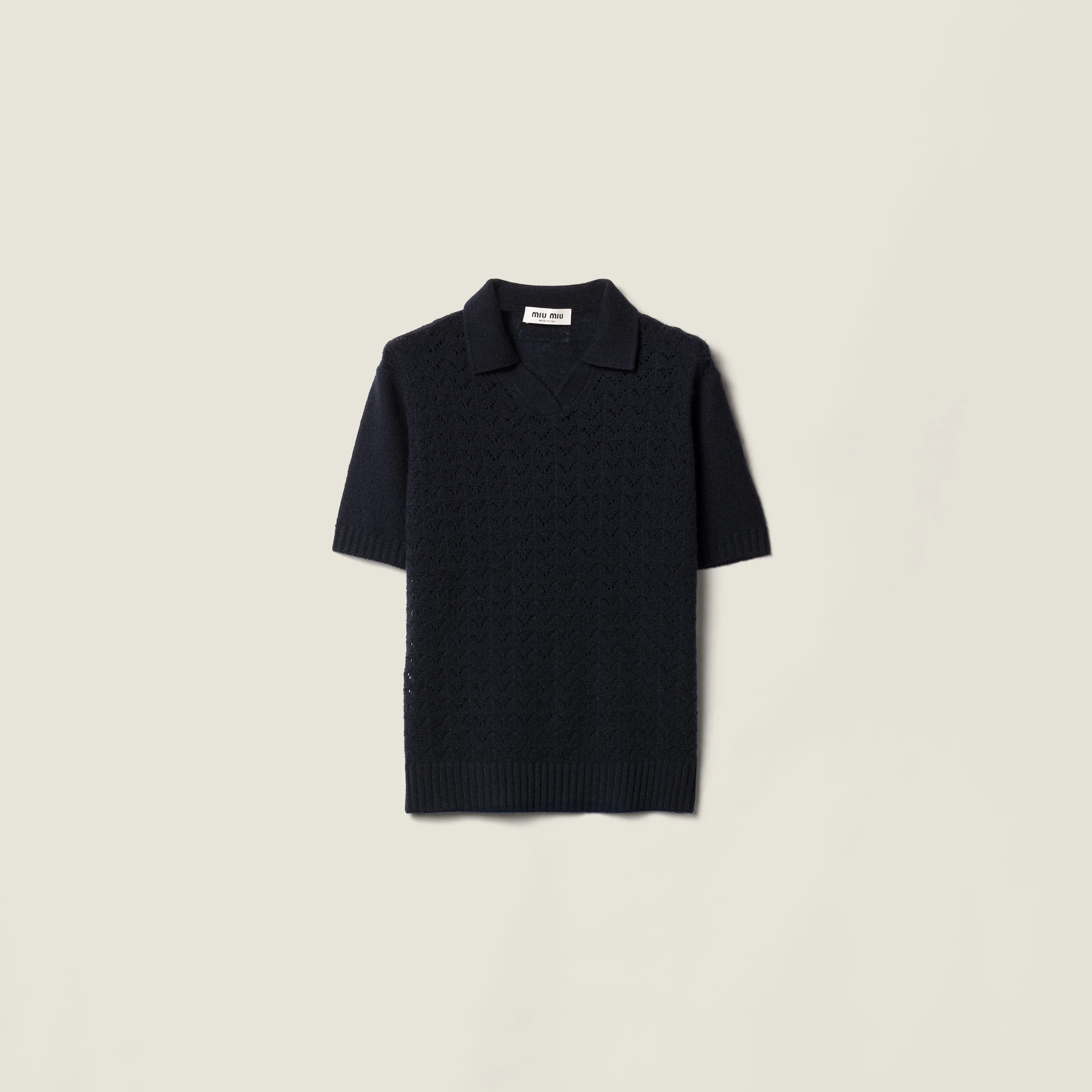 The exquisite softness of cashmere is reflected in a refined lace-effect openwork knit, defining the appeal of this polo with a versatile silhouette, perfect for both elegant and casual ensembles, and elevated by the logo label on the back. - Product code: MML03U_185I_F0008_S_OOO - Openwork knit - Regular fit - Long sleeves - Short sleeves - Ribbed neckline - Semi-raglan shoulder - Ribbed cuffs and hem - Knitted logo patch - Imported - The model is 176 cm tall and wears a size 38 Height 45cm Materials Main material: 100% Cashmere