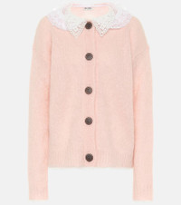 An airy white lace collar brings Miu Miu's quintessential charm to this cardigan. Oversized buttons add a further sense of fun to this piece, which makes a sweet impression in pale pink. It looks as soft as it feels, too, as it's spun from a blended knit featuring fuzzy mohair and a touch of wool. Product Details - Trim: 95% cotton, 5% polyester - Made in Italy - Material: 67% mohair, 28% polyamide, 5% wool - Designer color name: Petalo - Closure: buttoned front - Care instructions: dry clean - Item number: P00497517 Size & Fit - True to size - Dropped shoulders - Oversized - Falls to the hip - The model seen in the picture is 178cm-5'10" and wearing a size IT 40