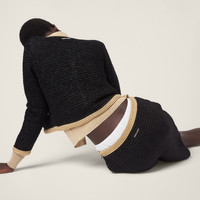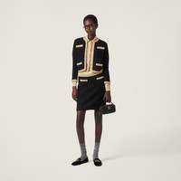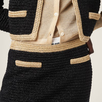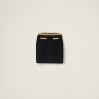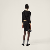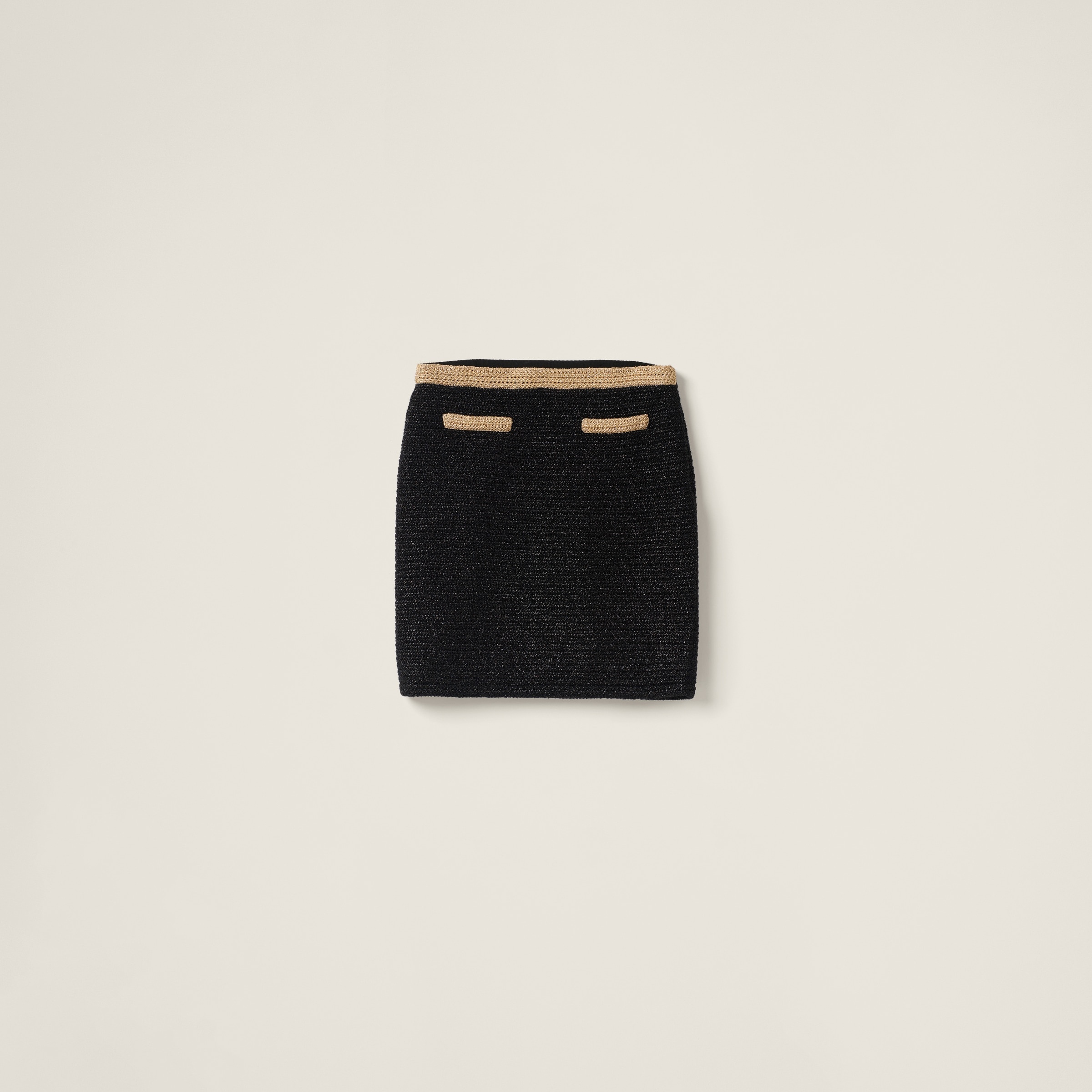 Miu Miu takes the classic inspiration of this skirt and pairs it with fine crochet, the luminous touch of lame yarn, and the iconic note of the logo patch. - Product code: MMG483_1386_F0002_S_OOO - Crochet - Pencil silhouette - Logo patch - Side zipper closure - Imported - The model is 178 cm tall and wears a size 38 Height 48cm Materials Main material: 50% Metal/Metallized Fiber 50% Polyamide