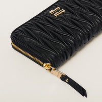 The iconic Matelasse motif reflects Miu Miu's refined artisan codes, enhancing the sleek, elegant design of this nappa leather wallet. - Product code: 5ML506_AFPP_F0002 - Matelasse workmanship - Zipper closure - Two bill compartments - Eight card slots - Two internal pockets - Internal zipper coin pocket - Moire lining - Metal lettering logo - Imported Height 9.5cm Width 19.5cm Materials Main material: Lambskin