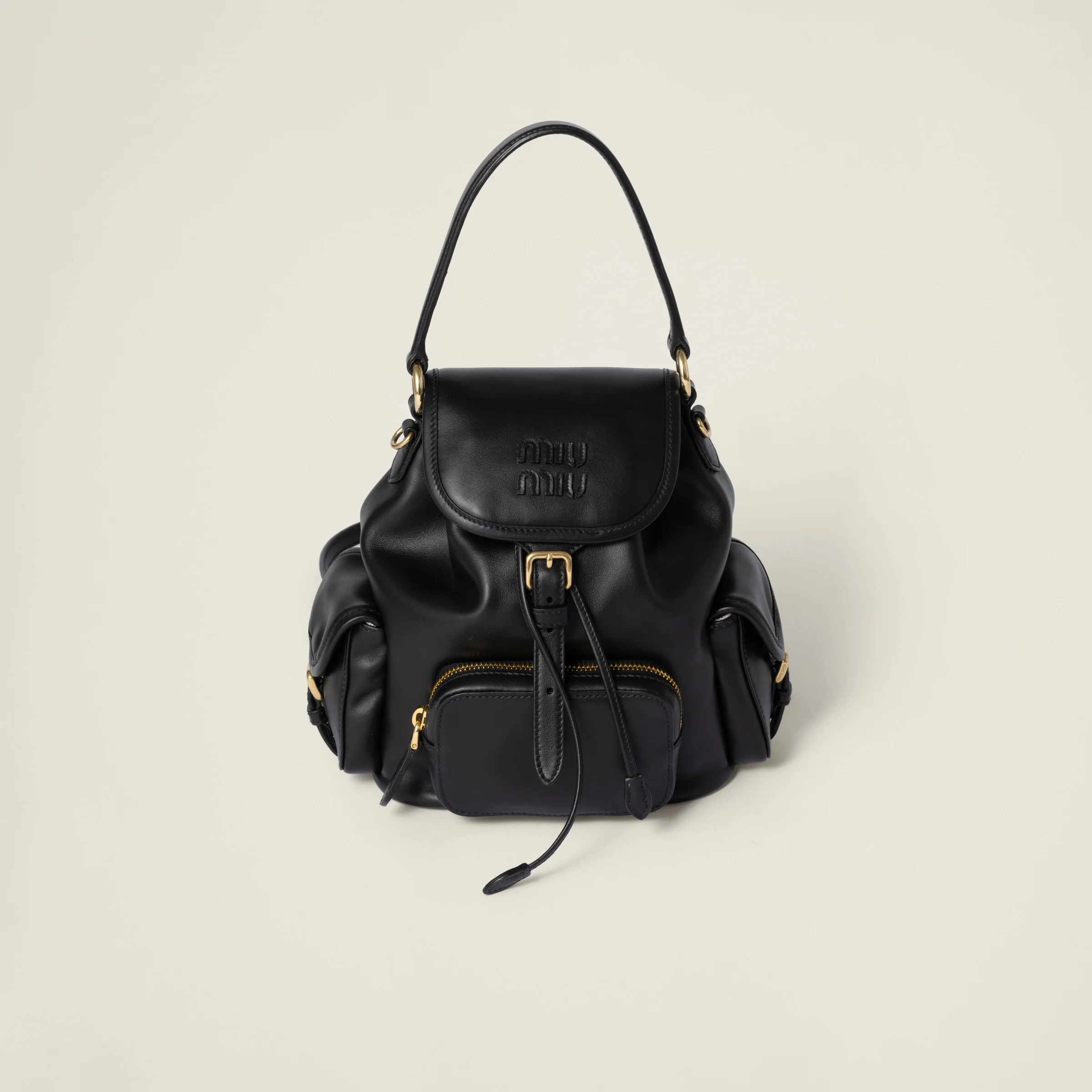 This leather backpack inspired by school gear combines artisan appeal and a casual attitude. The multi-pocket design and the option of wearing it as a crossbody bag express the contemporary and playful spirit of Miu Miu bags. - Product code: 5BZ043_2CRW_F0002_V_OOO - Leather handle - Front zipper pocket - Side flap pockets - Gold-tone hardware - Flap closure with buckle - Linen blend interior with patch pocket - Backpack can be worn two ways: classic harness with straps, minimum length 65 cm, maximum length 68 cm, or crossbody strap, length 110 cm - drop 53 cm - Leather lettering logo on the flap - Imported Height 22cm Width 18cm Length 11.5cm Materials Main material: Calfskin