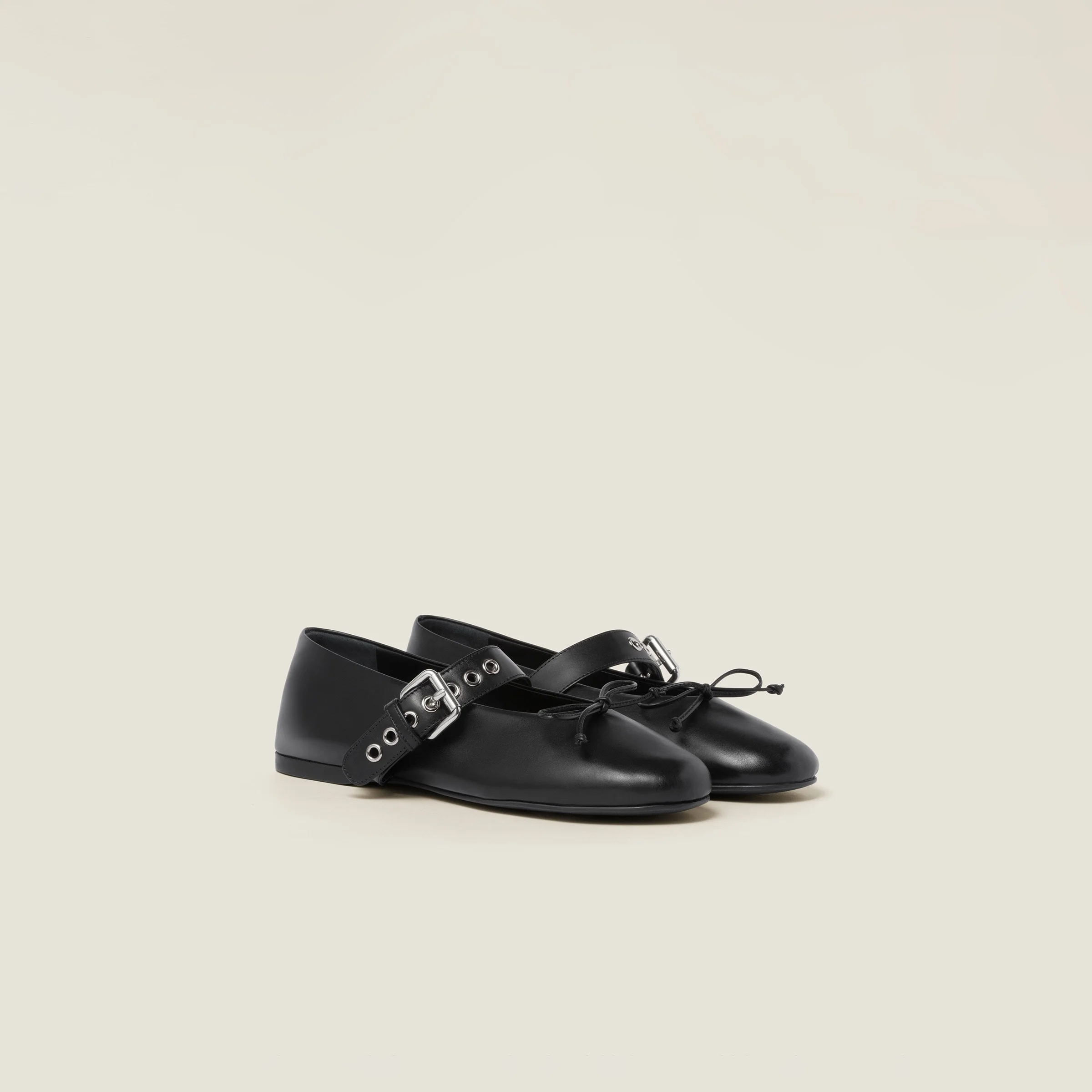 Smooth leather highlights the nuances and details of these leather ballerinas. The buckle and bow introduce a refined stylistic contrast while the Miu Miu logo adds its signature to this stylish version. - Product code: 5F210E_070_F0002_F_005 - Upper with strap, buckle and bow - Screen-printed logo - Rubber sole - Leather-covered insole - Imported Materials Main material: Calfskin