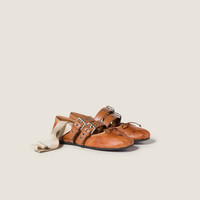 The iconic character of the Miu Miu ballerina flat emerges in the contrasts of this leather version with a sophisticated, natural effect enhanced by the ribbon detail and the bold straps with buckles. - Product code: 5F466A_3ZLV_F098L_F_G005 - Upper with straps, buckles and removable ribbons - TPU sole - Leather-covered insole - Screen-printed logo - Imported Materials Main material: Lambskin