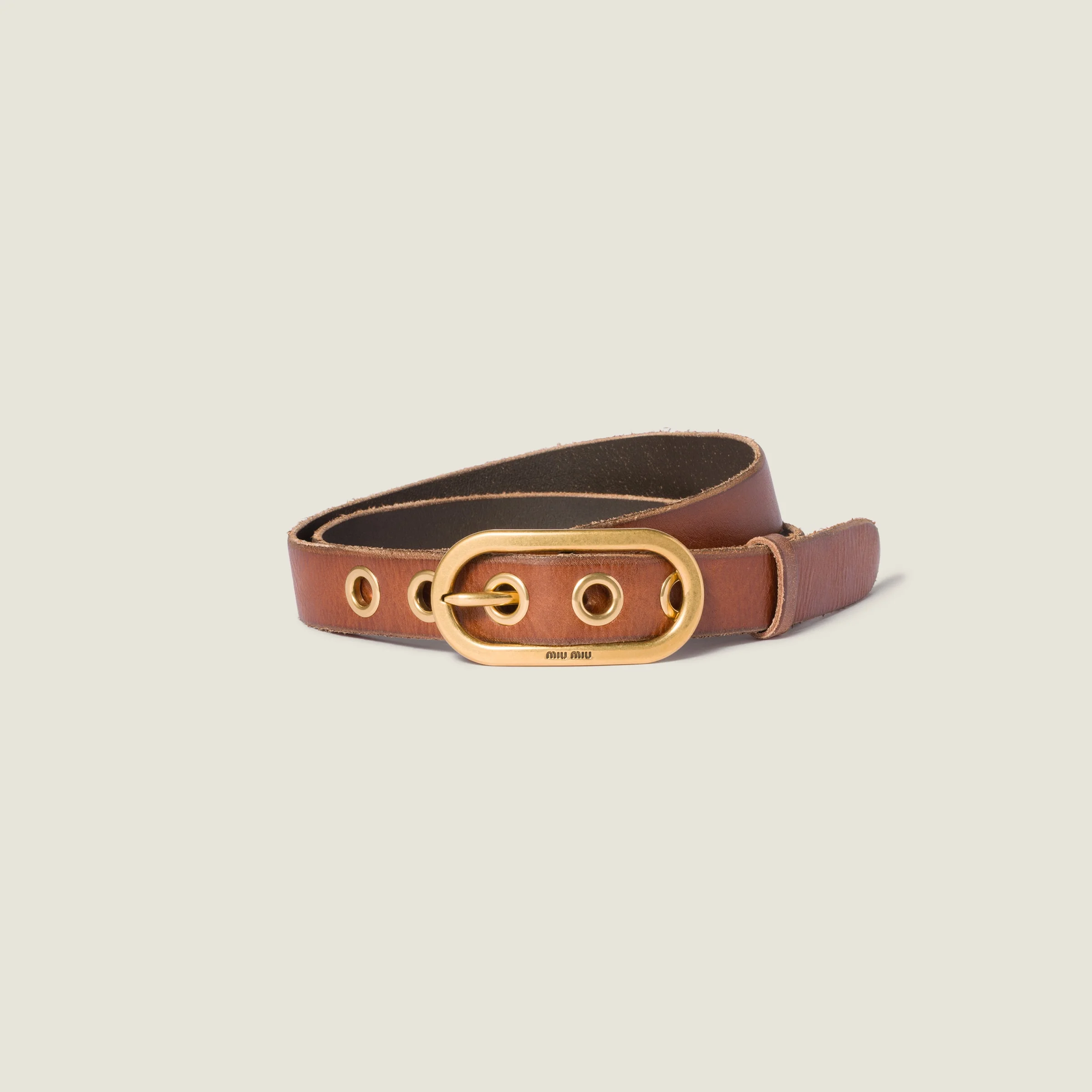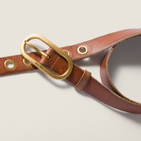 The contrast between contemporary and retro emerges in the details of this soft leather belt with an antiqued effect, enriched by a gold buckle that recalls Miu Miu's experimentation with codes of the past. - Product code: 5CC699_2IES_F0046 - Antiqued-effect craftsmanship - With eyelets - Metal buckle - Visible logo on buckle - Imported Height 2.5cm Materials Main material: Calfskin