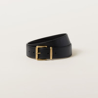 Elegant and minimalist in design, this leather belt is characterized by the Miu Miu logo that embellishes the belt loop. - Product code: 5CC536_2AIX_F0002 - Metal buckle - Laser-engraved logo on belt loop - Imported Height 3.5cm Materials Main material: Calfskin