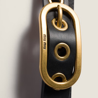 Ideal for both simple and sophisticated styling, this leather belt stands out for its minimalist design and gold-tone buckle engraved with the Miu Miu logo. - Product code: 5CC699_2HIL_F0002 - Metal buckle - With belt loop - Visible logo on buckle - Imported Height 2.5cm Materials Main material: Calfskin