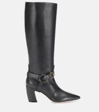 Add a tough-luxe touch to Miu Miu's roster of whimsical dresses with these smooth leather boots. Crafted in Italy, the design is shaped with a pointed toe and embellished with buckles at the sides. Product Details - Lining: leather - Closure: buckle fastening - Sole: leather insole, leather and rubber sole - Upper: calf leather - Toe shape: pointed toe - Designer color name: Nero - Made in Italy - Item number: P00404142 Size & Fit - True to size - European sizes - 8cm-3" heel (size EU 38) - 38cm-15" shaft height (size EU 38) - 37cm-14.5" shaft width (size EU 38) - shaft width measured on largest part of boot