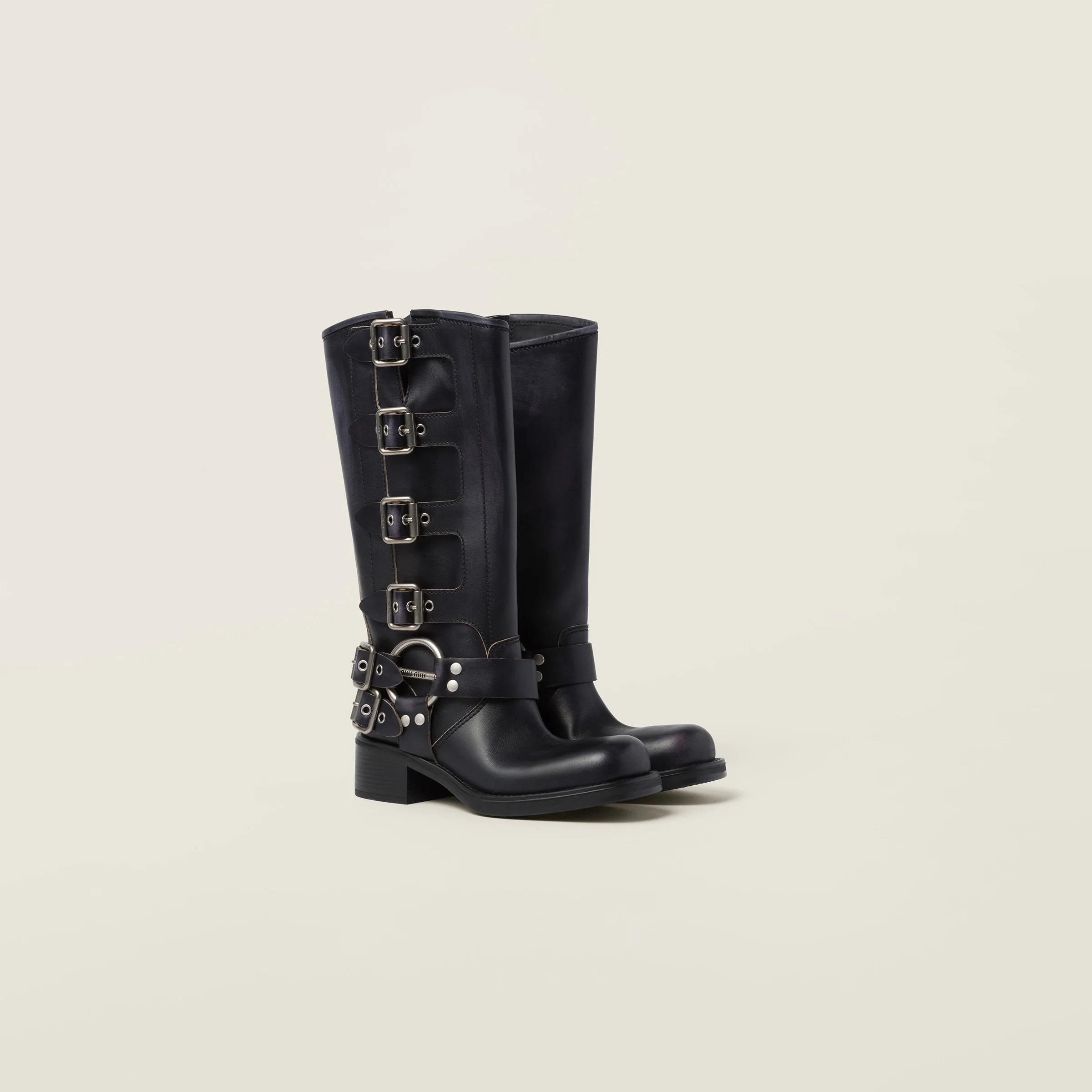 A refined design, the result of contrasting textures, characterizes these leather boots The buckles running along the side of the boot give it a strong character. The hot-stamped logo decorates this style. - Product code: 5W792D_3F33_F0002_F_A050 - Upper with straps, buckles, and logo-engraved harness ring - Leather lining - Hot-stamped logo - 32 cm boot leg - Rubber sole - 50 mm heel - Leather insole - Imported Materials Main material: Calfskin