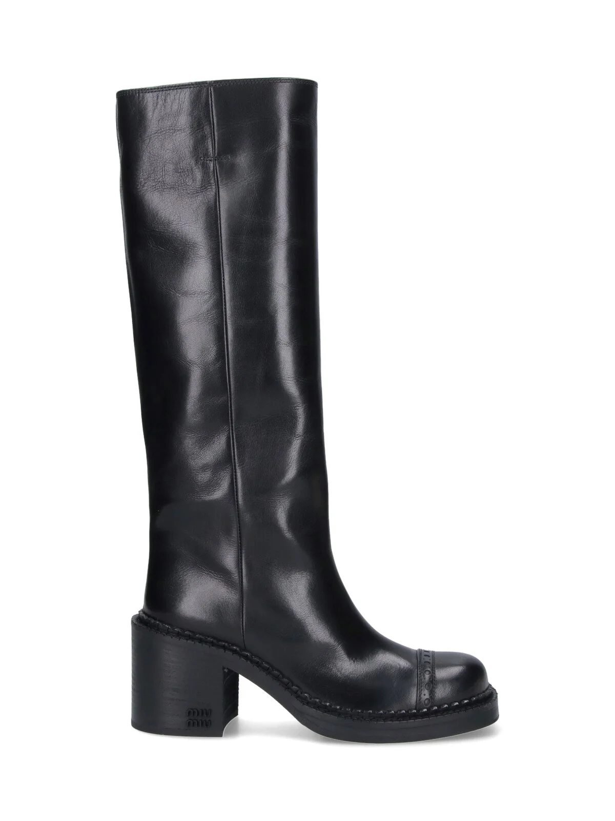 MIU MIU BLACK LEATHER BOOTS WITH SQUARE TOE, BROGUE TOE DETAIL, EMBOSSED LOGO ON THE HEEL, SQUARE HEEL, LEATHER AND RUBBER SOLE. PRODUCT INFO PRODUCT CODE 5W493E 075 007F0002 COMPOSITION: 100% BUFFALO LEATHER SIZE AND FIT: HEEL: 7.5 CM MADE IN: ITALY