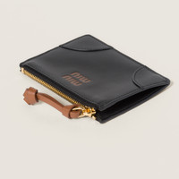 Fine leather and the iconic touch of the Miu Miu logo enrich the sleek lines of this new leather card holder. Card slots and a key ring complete the design with functional details. - Product code: 5MC093_2CSB_F0B7K - Zipper closure - Screen-printed logo - Three card slots - External zipper pocket - Moire lining - Removable metal keyring - Imported Height 8cm Width 11cm Materials Main material: Calfskin