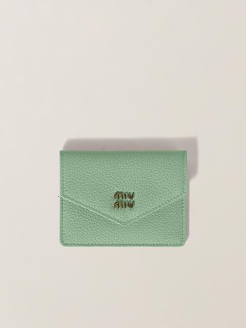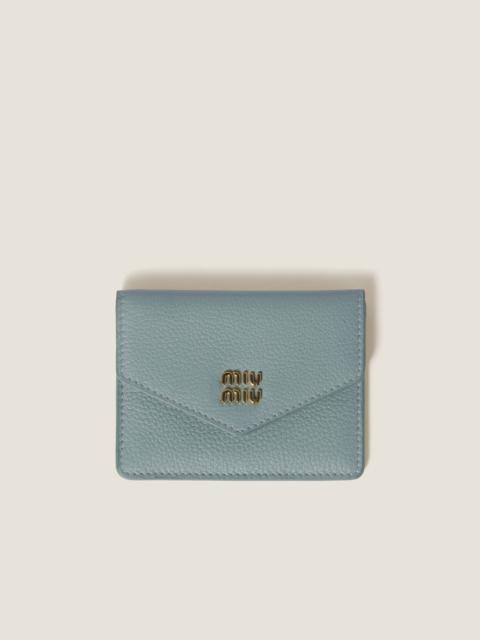 The simple charm of this card holder combines the uniqueness of soft leather and the gold-tone metal logo that makes the accessory a symbol of Miu Miu style. - Product code: 5MF031_ADT7_F0229 - One card slot - One internal pocket - External pocket with card slot - Snap closure - Moire lining - Metal lettering logo - Imported Height 8.5cm Width 10.5cm Materials Main material: Calfskin