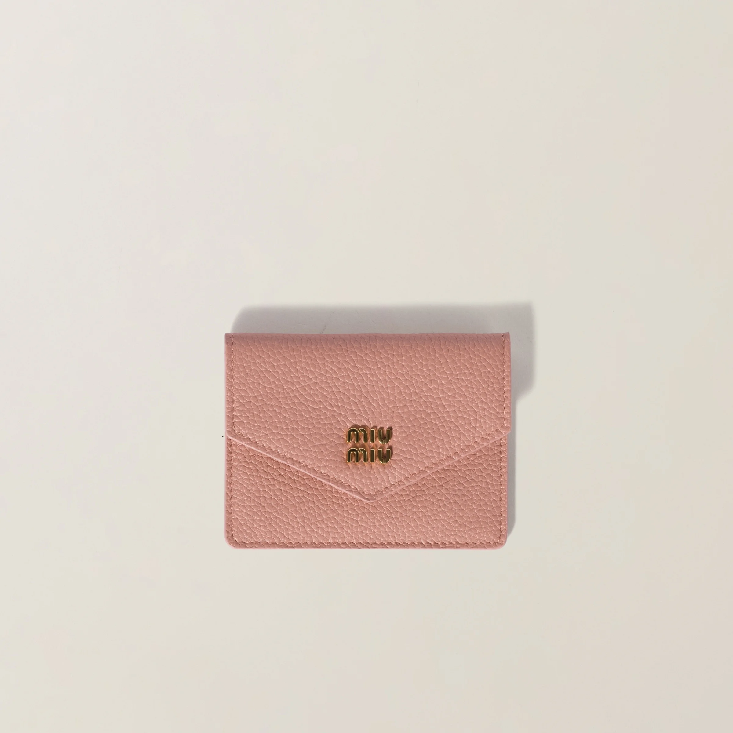 The simple charm of this card holder combines the uniqueness of soft leather and the gold-tone metal logo that makes the accessory a symbol of Miu Miu style. - Product code: 5MF031_ADT7_F0615 - One card slot - One internal pocket - External pocket with card slot - Snap closure - Moire lining - Metal lettering logo - Imported Height 8.5cm Width 10.5cm Materials Main material: Calfskin