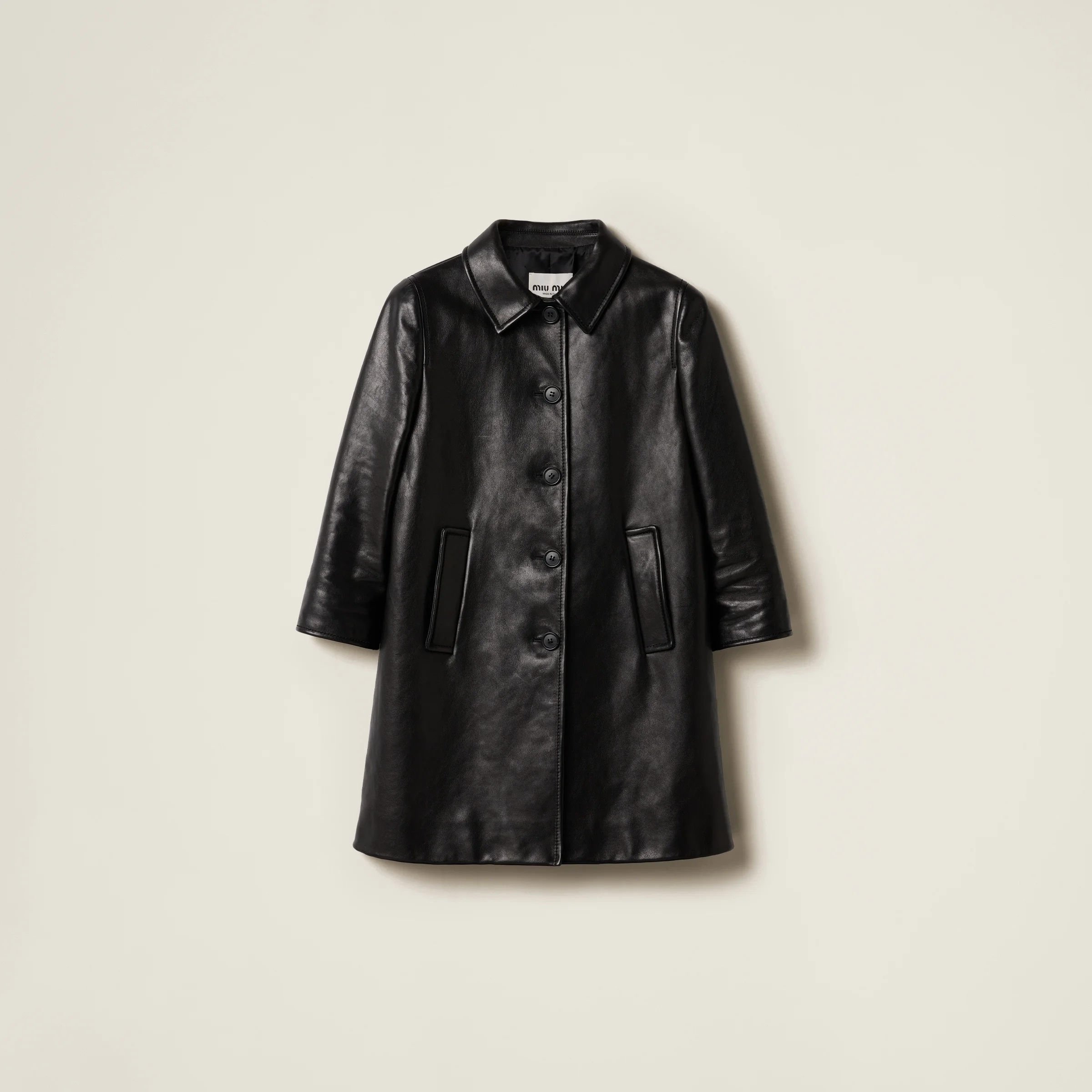 Vintage-inspired details define the silhouette of this leather coat, which features a slim cut, three-quarter-length sleeves, and embossed logo lettering. - Product code: MPS732_15YZ_F0002_S_OOO - Lined - Regular fit - Front button closure - Slit at back - Shirt collar - Three-quarter length sleeves - Slash pockets - Embossed logo lettering - Imported - The model is 179 cm tall and wears a size 38 Height 73cm Materials Main material: Calfskin