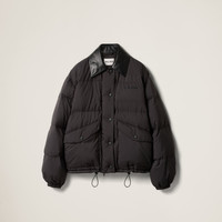 The tonal leather collar creates a refined contrast on this technical ponge down jacket. The drawstring hem and elasticized cuffs add sporty details while the logo completes the design. - Product code: ML1107_15WX_F0002_S_OOO - Oversized - Goose down padding - Leather collar - Long sleeves - Elasticized cuffs - Zipper and snap closure - Patch pockets - Elasticized drawstring hem - Transfer print logo - Imported - The model is 177 cm tall and wears a size 38 Height 72cm Materials Main material: 100% Recycled Polyester
