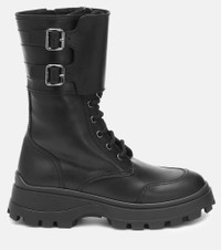 Miuccia Prada’s rebellious tendencies are apparent in these black ankle boots from Miu Miu. Made in Italy from smooth leather, they secure via wide, buckle-fastened straps, and are set on chunky rubber soles. Showcase yours with skinny pants and midi dresses alike. Product Details - Lining: leather - Sole: leather insole, rubber sole - Closure: buckle fastening, zipped side, lace-up - Toe shape: round toe - Upper: leather - Designer color name: Nero - Made in Italy - Item number: P00489029 Size & Fit - Fits slightly large to size - we recommend trying a half size smaller - European sizes - 3,5cm-1.5" platform (size EU 38) - 5cm-2" wedge heel (size EU 38)