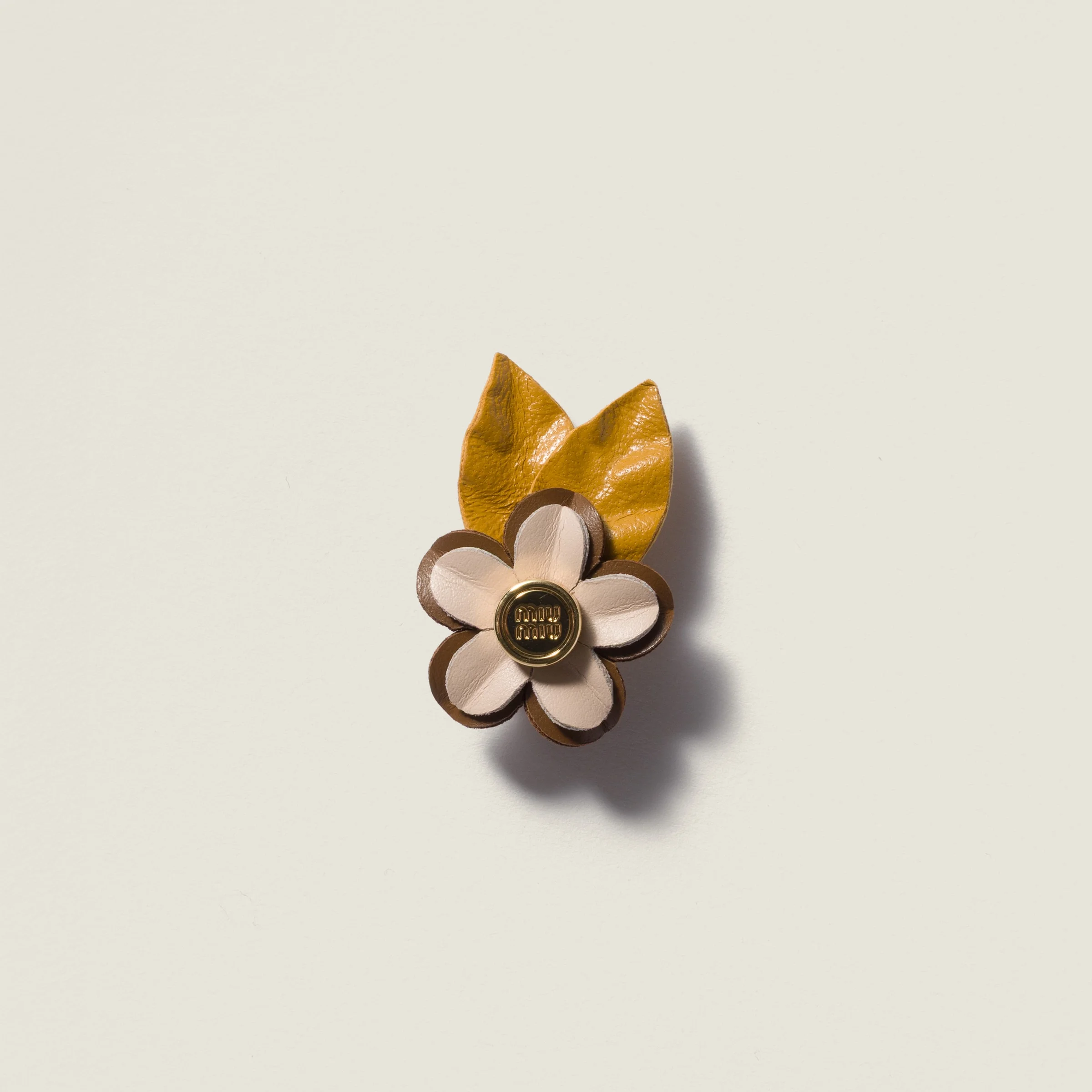 Miu Miu's bold, playful character comes to life in this floral-inspired brooch with metal logo that enriches the silhouette of sneakers and bags, creating unique style combinations. - Product code: 5TT282_2FLQ_F0MI4 - In leather and metal - With pin fixed on the back - Visible engraved logo - Imported Height 2.5cm Width 3.5cm Materials Main material: Calfskin