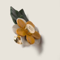 Miu Miu's bold, playful character comes to life in this floral-inspired brooch with metal logo that enriches the silhouette of sneakers and bags, creating unique style combinations. - Product code: 5TT282_2FLQ_F0NMD - In leather and metal - With pin fixed on the back - Visible engraved logo - Imported Height 2.5cm Width 3.5cm Materials Main material: Calfskin