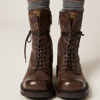 These sleek leather booties with refined details are characterized by the perforated motif on the upper, the laces wrapped around the boot, and the Miu Miu logo on the tongue. - Product code: 5U316E_2KJ_F0324_F_G035 - Upper with perforations - Leather lining - Embossed logo on the tongue and screen-printed on the insole - Side zipper and laces closure - Boot leg: 21 cm - Rubber sole - Heel height: 35 mm - Rubber heel with metal logo - Leather insole - Imported Materials Main material: Calfskin