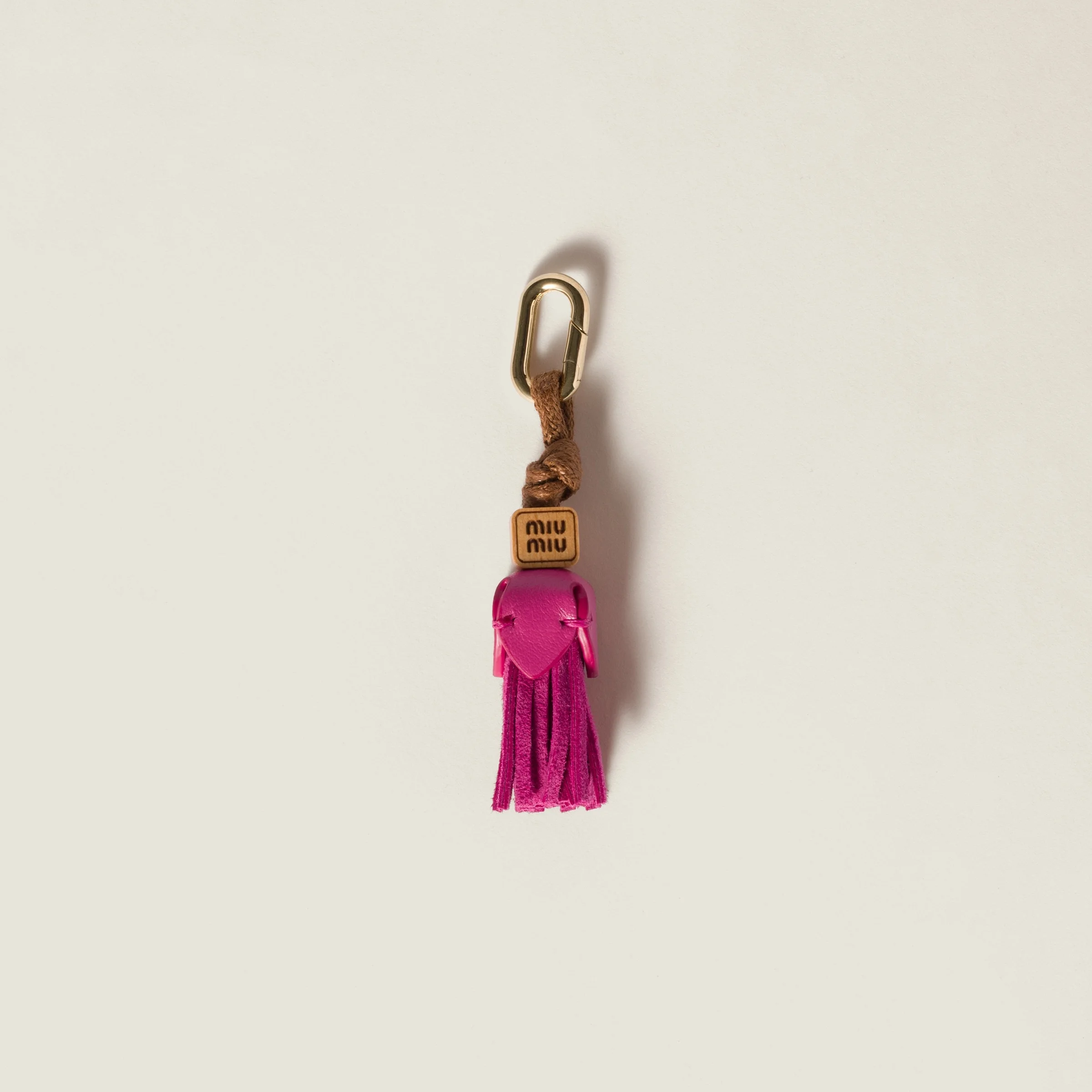Miu Miu's bold, playful character comes to life in this soft leather micro trick with wooden logo that enriches the silhouette of sneakers and bags, creating new style combinations. - Product code: 5ID007_2FLQ_F0029 - Waxed cotton cord - With wooden detail - Engraved logo on detail - With removable metal snap-hook - Imported Materials Main material: Calfskin