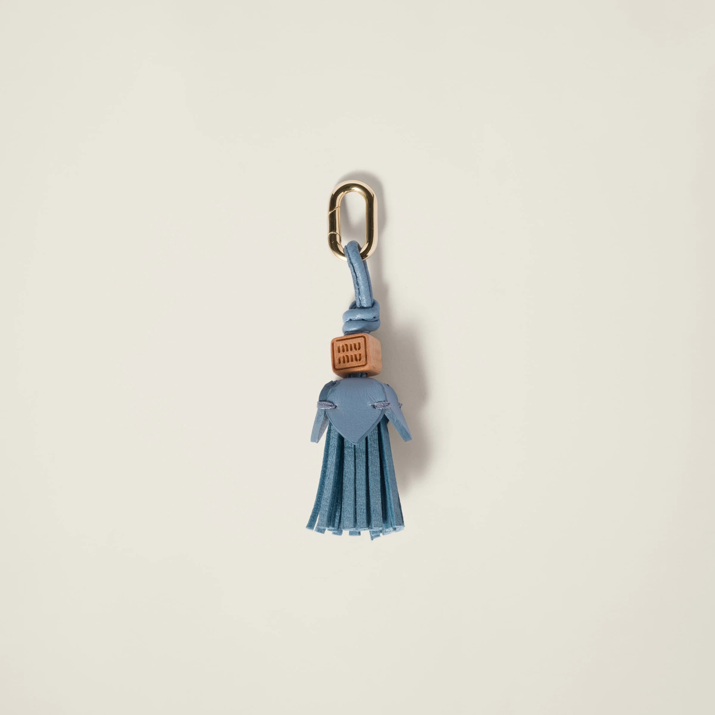 Miu Miu's bold, playful character comes to life in this soft leather micro trick with wooden logo that enriches the silhouette of sneakers and bags, creating new style combinations. - Product code: 5ID007_2FLQ_F0637 - Waxed cotton cord - With wooden detail - Engraved logo on detail - With removable metal snap-hook - Imported Materials Main material: Calfskin